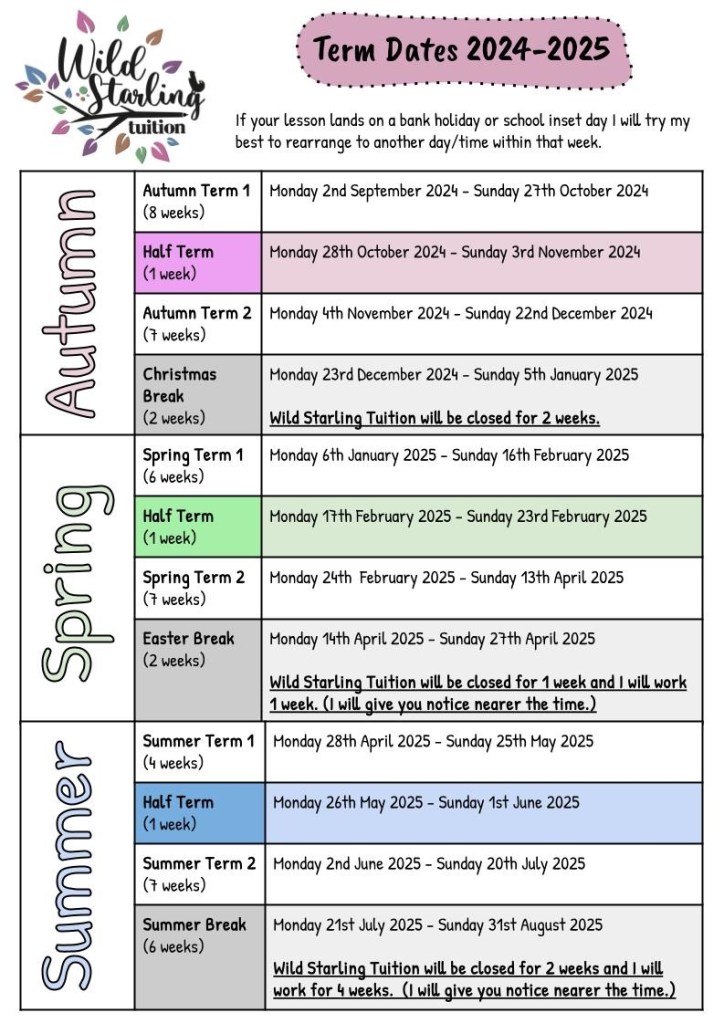 These terms and conditions are valid for all tuition from September 2021. Parents will receive a copy of these at the trial session, I will also have a copy on my website www.wildstarlingtuition.co.uk in case you need to refer back to them. I reserve the right to make changes to these terms and conditions from time to time, parents will be notified beforehand.